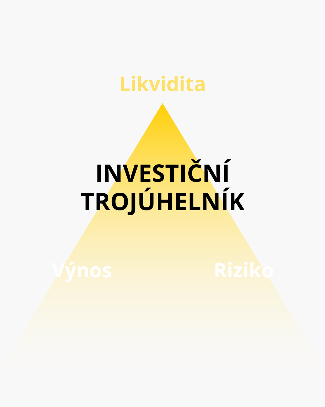Tyto tři pojmy tvoří pomyslný investiční trojúhelník. Zpravidla platí, že není možné mít vše najednou – vysoký výnos, nízké riziko a vysokou likviditu.